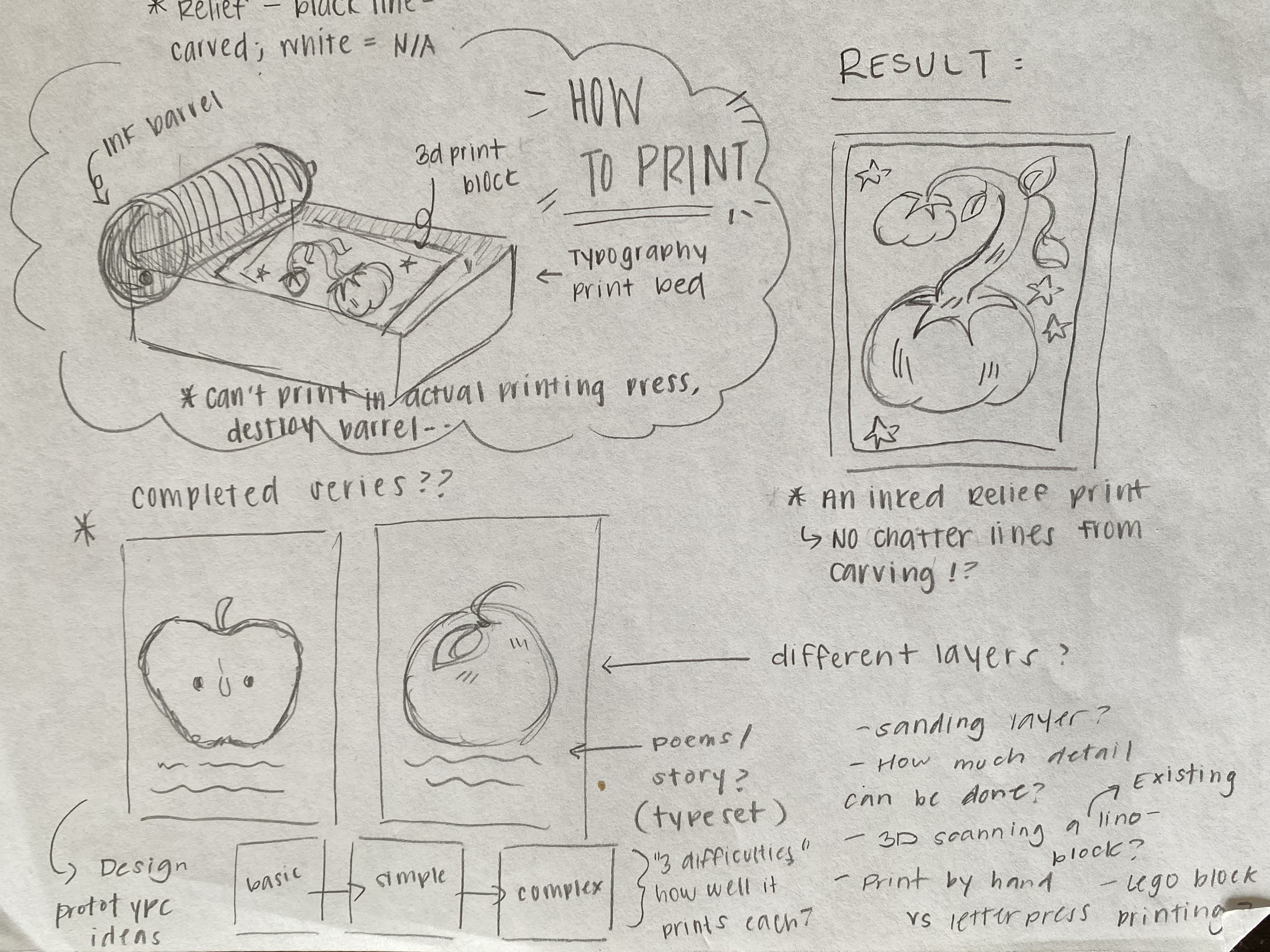 Over the weekend, I drew a rough project sketch of my idea and the questions I hope to answer. My capstone project will be combining relief printmaking and 3D printing, transforming both traditional and digital practices. As a result, these prints will come together as a series, with a typeset story/poem to connect them. I decided to treat this project mainly as an experiment; however, the end goal will be my results and the series of works I completed. Throughout the second week, we were tasked with developing our project and fleshing out the details. This was mainly done by completing an exhibition proposal or prospectus (which can be found here on my website, if interested).