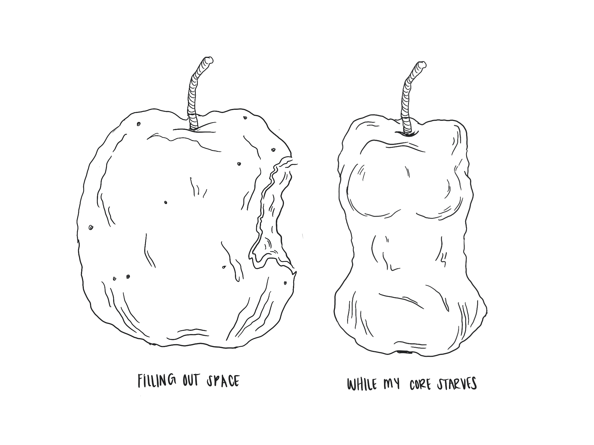 Subtracting one from each homemade paper total for prints to be displayed on a wall, I will have 3 apple cores and 2 apple bodies on homemade paper