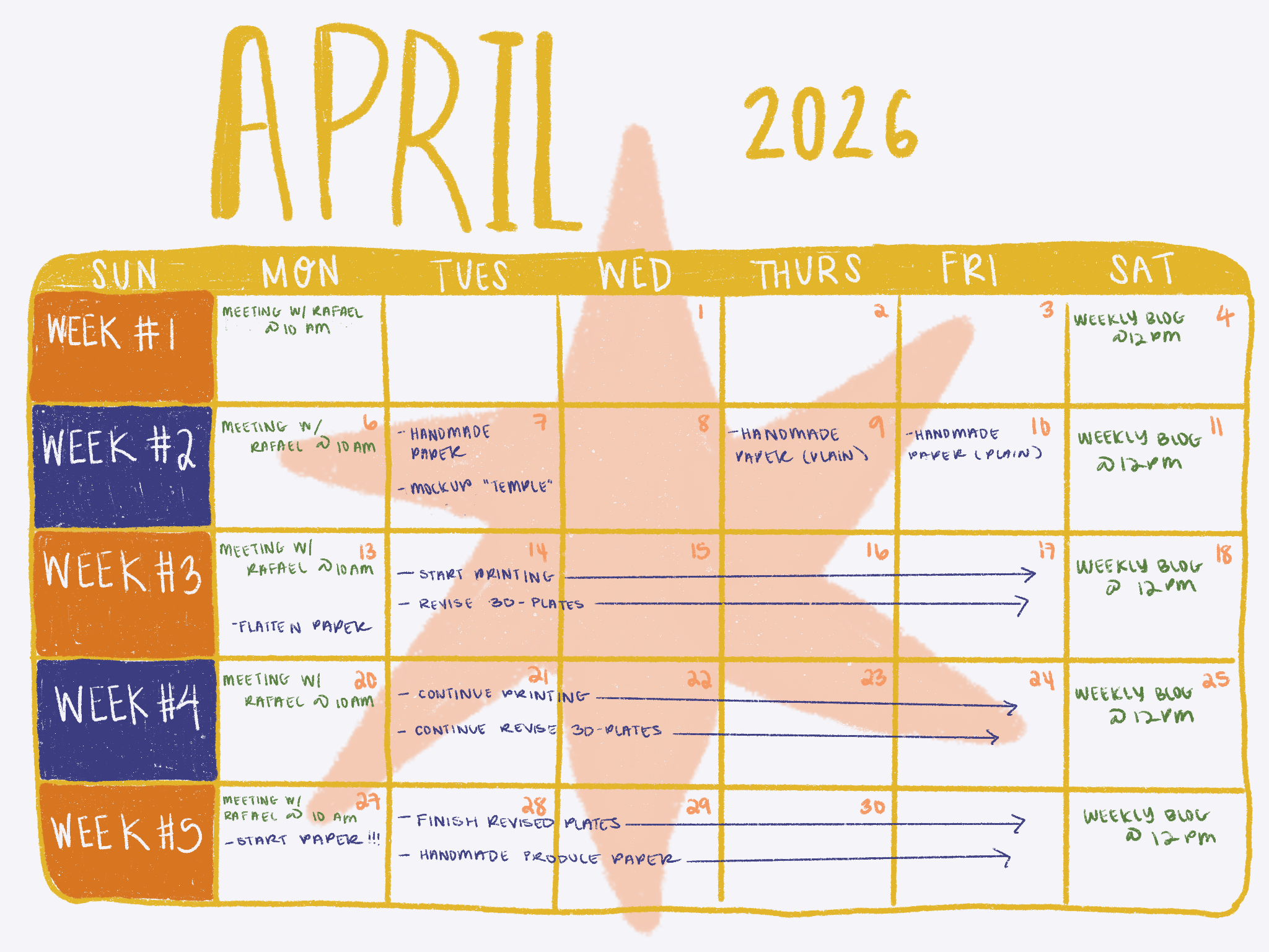 As discussed previously, Mondays were set aside for Rafael and me to review the project and ensure I’m on track with the timeline. Today, being our first meeting, we primarily discussed what I’m doing in this Independent Study, expectations and responsibilities, what to consider, what questions to answer, and who to look at! With this Independent Study, I’m looking to expand on my project in two aspects: 1) Create more editions of books/zines and 2) Improve “Temple’s” presentation. Originally, I created only three editions of the fruit/vegetable scrap paper and seven editions on Springhill Digital paper. However, I was prouder of the handmade paper editions. Alongside the books, I hung each page on a whiteboard for people to look at. During the Capstone critique, however, I noticed my peers' hesitancy to examine the work more closely and kept a certain distance.