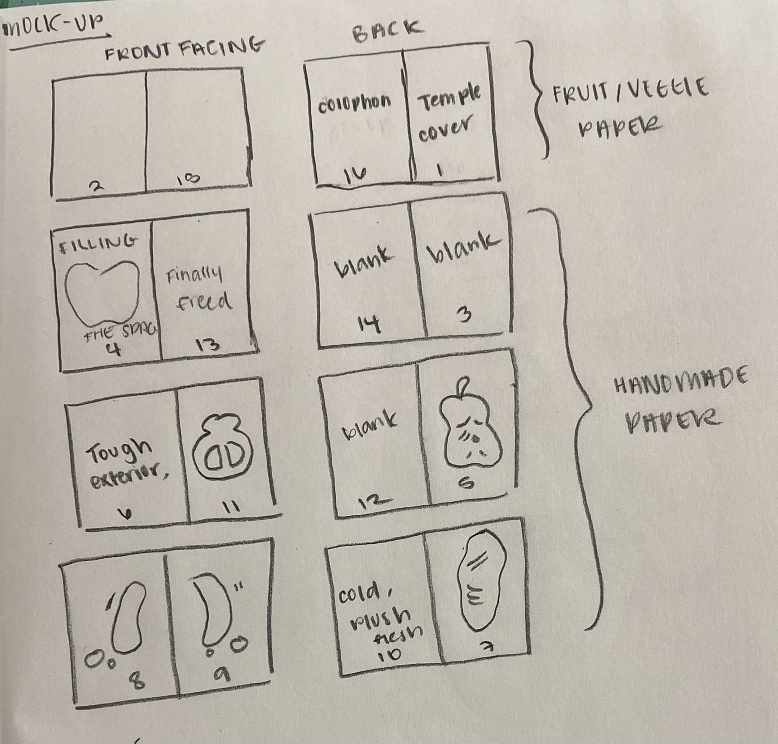 Tuesday, April 7th, 2026: Today, I worked on creating a proper mock-up to experiment with pacing and understanding how many handmade sheets I would need to pull. After finalizing the mock-up for “Temple,” I used 4 folded sheets of 5.5” x 9”, 1 sheet is the front and the back, which will be fruit/vegetable scraps, and the other 3 sheets are for the actual poem, using plain, handmade paper. 3 sheets of paper per 15 books is 45 sheets of handmade paper that need to be pulled, and 1 sheet per 15 books is 15 sheets of handmade paper WITH produce scraps. Adding all those numbers together for all 15 books of “Temple,” I’m pulling 60 sheets of handmade paper.